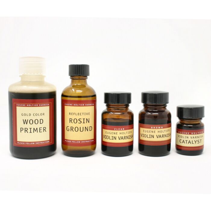 Il sistema di verniciatura di Eugene Holtier è stato sviluppato dopo centinaia e centinaia di ore di sperimentazione e formulazione dei prodotti. Le classiche vernici italiane devono essere state ottenute con ingredienti relativamente semplici, ed il sistema Holtier aderisce a questo concetto. Il sistema è composto da 5 prodotti: un Primer, un riflettente, la vernice colorata, la vernice incolore ed un catalizzatore (opzionale). Il primer per legno color oro ed il ground riflettente alla colofonia sono un modo per preparare e trattare il legno di uno strumento musicale prima dell'applicazione della vernice. Quanto più attraente è questo strato, tanto più efficace sarà la vernice nel valorizzare la naturale bellezza del legno. Il Reflective Rosin Ground è un liquido trasparente che ha una viscosità molto bassa e si stende facilmente. Le vernici Eugene Holtier Brown e Clear sono realizzate con la migliore colofonia e olio di semi di lino pressato a freddo (rapporto 50-50 in peso). Questa vernice non contiene solventi, catalizzatori o pigmenti. È estremamente trasparente ma ricca di colore. La vernice è di medio spessore ma si stende facilmente e non è appiccicosa. Il colore marrone è molto intenso e sono necessarie solo poche mani per ottenere un colore ricco. La vernice incolore può essere miscelata per modificarne l'intensità oppure può essere utilizzata come strato finale. Se lo si desidera, è possibile utilizzare pigmenti o colori per pittura ad olio insieme alla vernice Eugene Holtier. L'asciugatura richiede l'esposizione agli UV per 3-4 ore sotto il sole intenso o almeno una notte nella scatola UV. Se non si dispone di una scatola UV forte o di una forte luce solare, potrebbe essere necessario il catalizzatore per aiutare a polimerizzare la vernice. Per maggiori dettagli sull'uso del sistema di verniciatura per violino Eugene Holtier, leggere la guida all'uso.