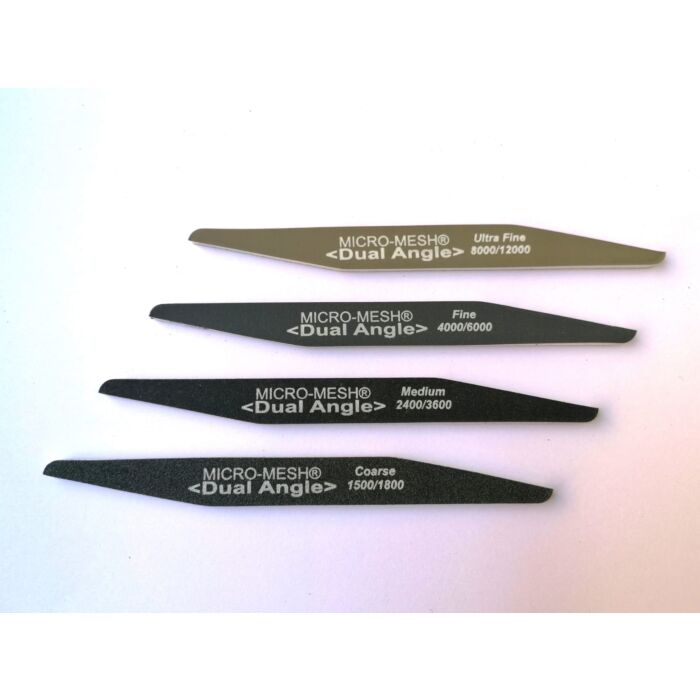La serie da 4 Micro-Mesh® Regular offre opzioni che vanno dalla grana 1500 alla 12000 e ogni lima ha una grana diversa sul lato opposto, quindi l'intero set comprende 8 grane Micro-Mesh ®.